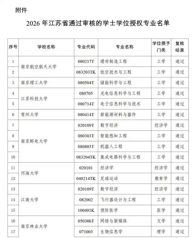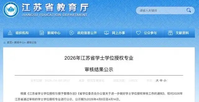 4月8日,江苏省学位委员会办公室对2026年江苏省通过审核的学士学位授权专业进行公示,包括南京航空航天大学增材制造工程在内的126个专业通过审核。公示期为2026年4月8日至4月14日。